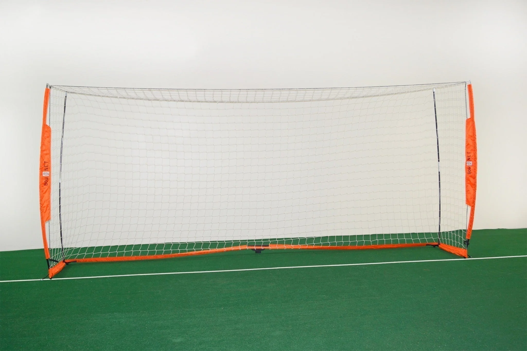 Set up a game anywhere, anytime with the Bownet 7' x 16' Portable Soccer Goal. Reliability, portability and strength make Bownet goals the resonated training and game goals among coaches and players worldwide. Bownet's E.A.S.® technology (Energy Absorption System®) helps reduce stress and tension on the netting, extend the lifespan of the net, create a more balanced goal, and adds flexibility and stability upon impact. The original BOW-poles and rigid steel frame are engineered to distribute goal weight across the bottom base. Leave more time to play with a goal that sets up in 165 seconds without the use of tools, guide wires, or heavy steel crossbars reducing risk of injury during game and practice. The goal has rubber non-marking feet to help maintain stance and traction indoor and outdoor. It can be easily moved across a field with the removal of the secured ground stakes. When the game is over, collapse the goal and place into the provided manageable roller case for easy portability and storage. One year limited manufacturer warranty available. Play Anywhere, Play Now, Play Bownet!®